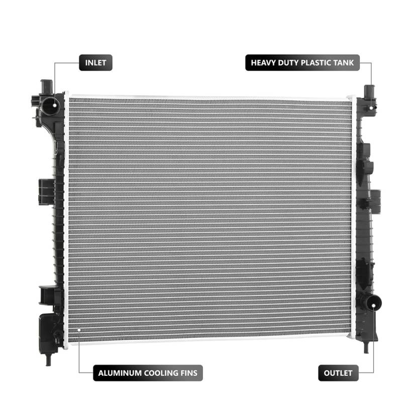 OEM replacement radiator with aluminum core and reinforced plastic tanks. Standard duty cooling design for Jeep and Dodge full-size SUV V6 Pentastar applications with direct bolt-on fitment. Not for heavy duty cooling applications.<br><br>