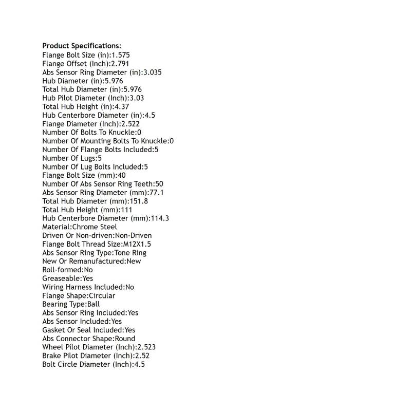 • Type: Rear Hub Bearing Assembly