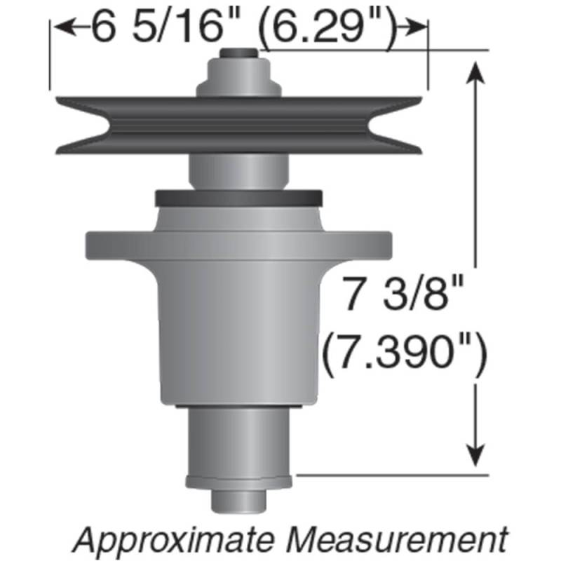 Direct replacement spindle assembly for Exmark Turf Tracer HP, Turf Tracer, and Turf Tracer S-Series walk-behind mowers. Replaces Exmark 103-9081. Assembly includes cutter housing, shaft, 6 1/4 inch pulley, splined bushing, and blade bolt. Overall height is 7 3/8 inches. Compatible with 48 and 52 inch deck configurations. Arrives fully assembled for immediate installation.