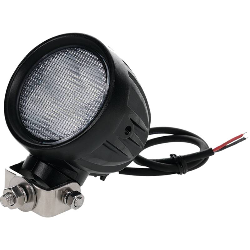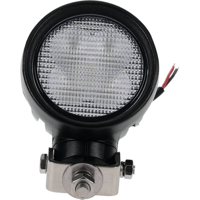 High-output 50 watt round LED work light delivering 3500 lumens of wide flood beam illumination. Unique 360 degree swivel mount allows precise aiming for optimal light coverage from any angle. Compact 4 x 4 inch round design with 5-1/2 inch depth and built-in Deutsch connector with mating pigtail for reliable weatherproof electrical connection. Operates on 12-24V DC drawing 4.1 amps. IP68 rated for complete dust and water submersion protection. Even flood pattern with minimal hotspots provides broad area coverage. 50,000 hour rated lifespan with Includes stainless steel mounting hardware for easy installation on any vehicle or equipment.